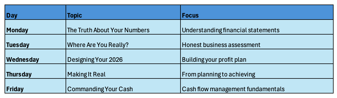 This isn't another course you'll never finish — it's five days of live action. This is your chance to work directly with a business turn-around expert who has helped over 250 businesses transform their results. If you're ready to understand your numbers, set a real plan for 2026, and finally take control - this challenge is where it starts.