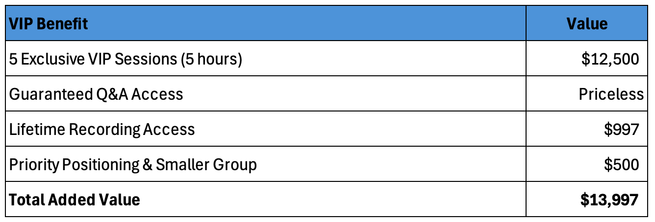 You get more time with me. You get guaranteed Q&A. You get exclusive access that the general admission participants simply don't have.