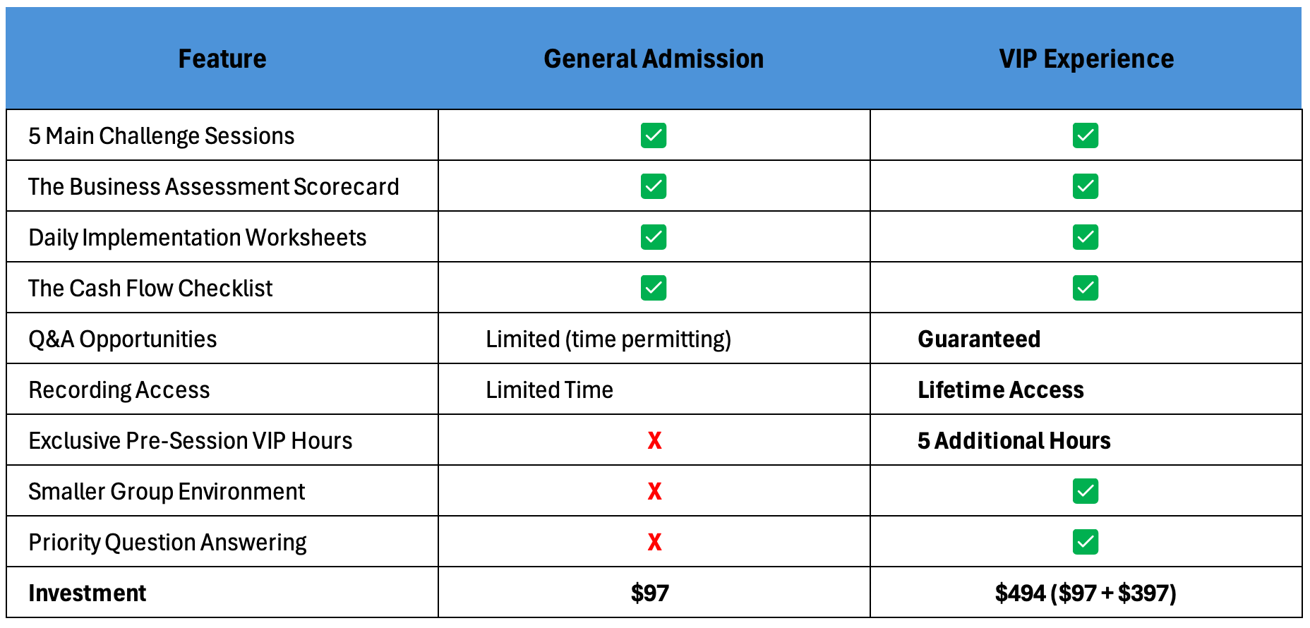 Five extra hours. Guaranteed answers. Lifetime recordings. This is the complete VIP experience - designed for business owners who refuse to settle for "good enough." You'll get more time, more access, and more transformation than general admission could ever deliver. If you're ready to invest in yourself at the level your business deserves, this is it.