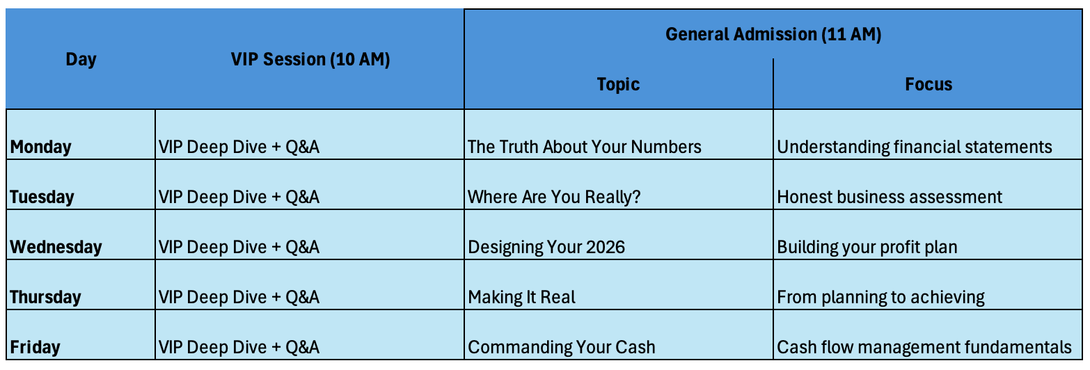 You've seen what the Breakthrough Business Mastery Challenge offers - 5 days of live, interactive training to finally understand your numbers, build a real profit plan, and take control of 2026.